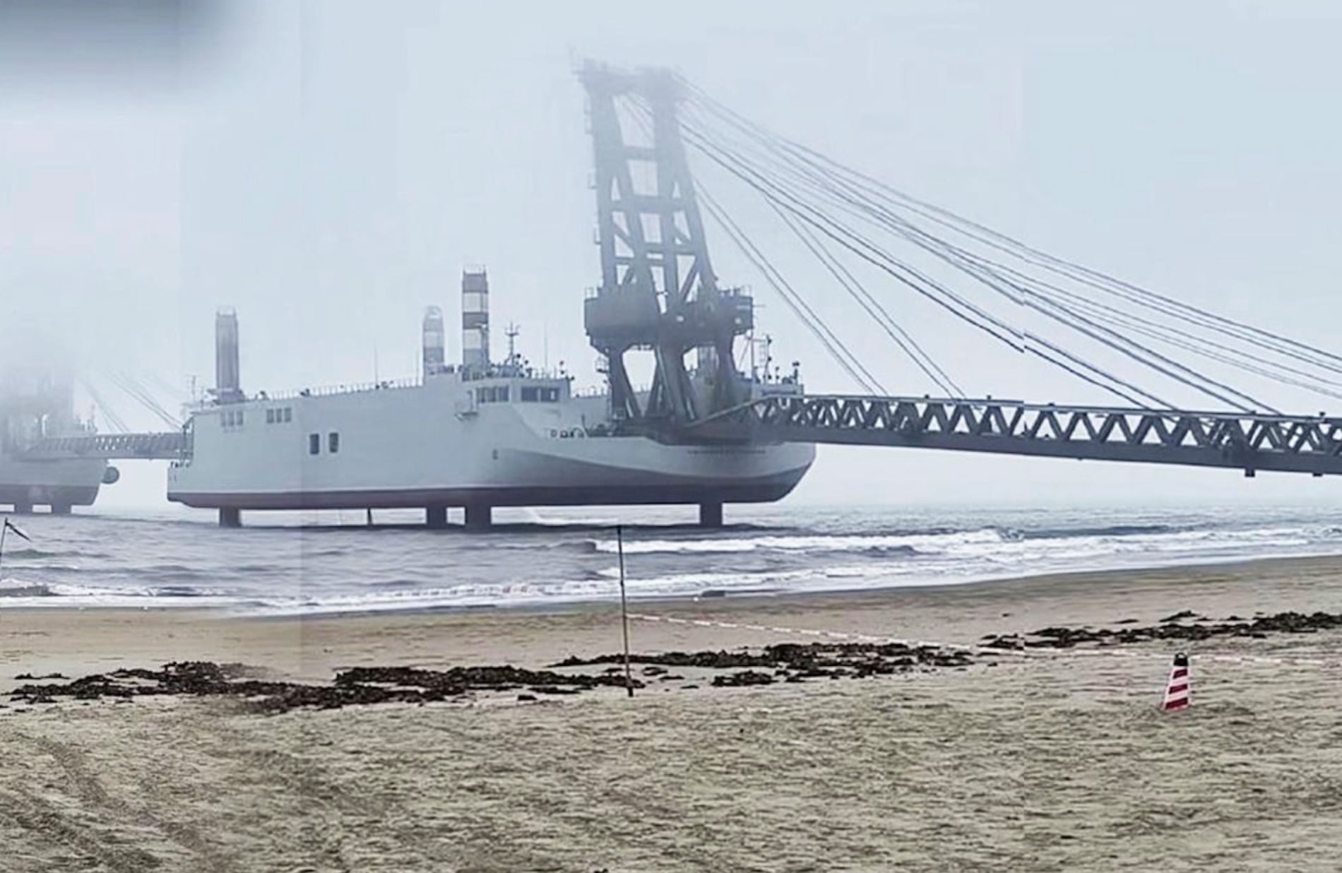 Sebuah tangkapan layar dari video di media sosial memperlihatkan sistem tongkang baru China yang dirancang untuk memindahkan pasokan dari kapal ke pantai secara lebih efisien. Video pendek tersebut direkam dari pantai umum di Provinsi Guangdong, China. Perekam video yang tidak diketahui identitasnya berdiri di dekat beberapa perahu nelayan dan wisatawan yang sedang berjalan-jalan. Di sebelah kanan mereka, jajaran kapal berukuran besar tampak samar dalam kabut. Kapal-kapal itu tidak bergerak, berdiri di atas ombak dengan ditopang tiang-tiang besar. Jembatan lipat menghubungkan kapal-kapal tersebut satu sama lain, dengan kapal terdepan yang menurunkan jembatan hingga ke pasir.