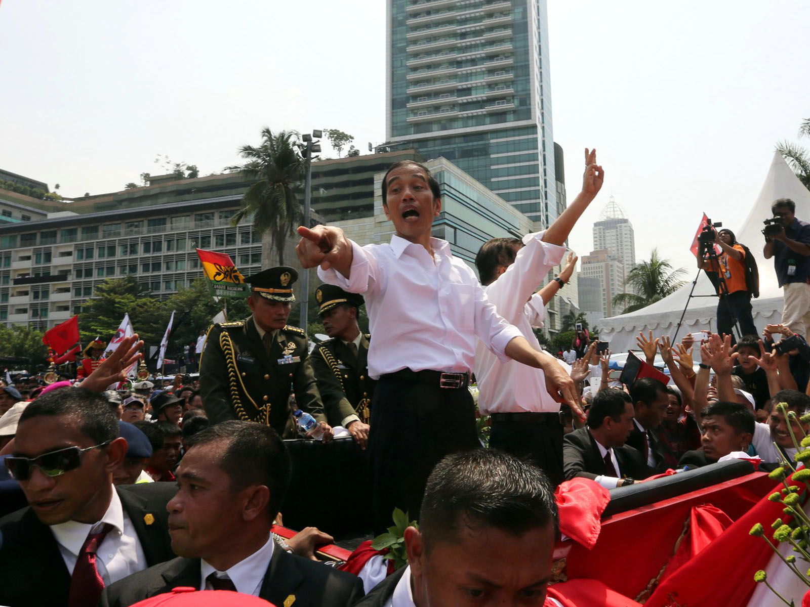 Presiden Joko Widodo dan Wakil Presiden Jusuf Kalla yang naik kereta kuda menuju Istana Kepresidenan menyapa warga yang menunggu di kawasan Bundaran HI setelah pelantikan di Gedung Parlemen Senayan di Jakarta, Senin 20 Oktober 2014.—-JP/RICKY YUDHISTIRA
