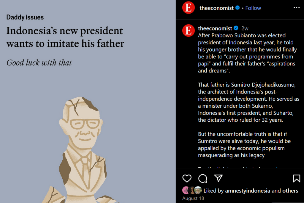 Post based on https://www.instagram.com/p/DNeiWi9M63r/, https://www.economist.com/asia/2025/08/14/indonesias-new-president-has-daddy-issues, and https://www.economist.com/asia/2025/05/15/prabowo-subiantos-economic-policy-is-weakening-indonesia.