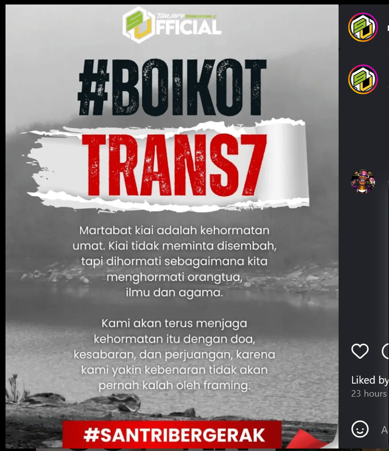 Following the broadcast, the hashtag #BoycottTrans7 went viral on social media as a form of protest. The public felt that the segment insulted the highly respected Islamic boarding school tradition, particularly among the non-government Islamic community organization Nahdlatul Ulama (NU) which boasts a membership of around 108 million members.