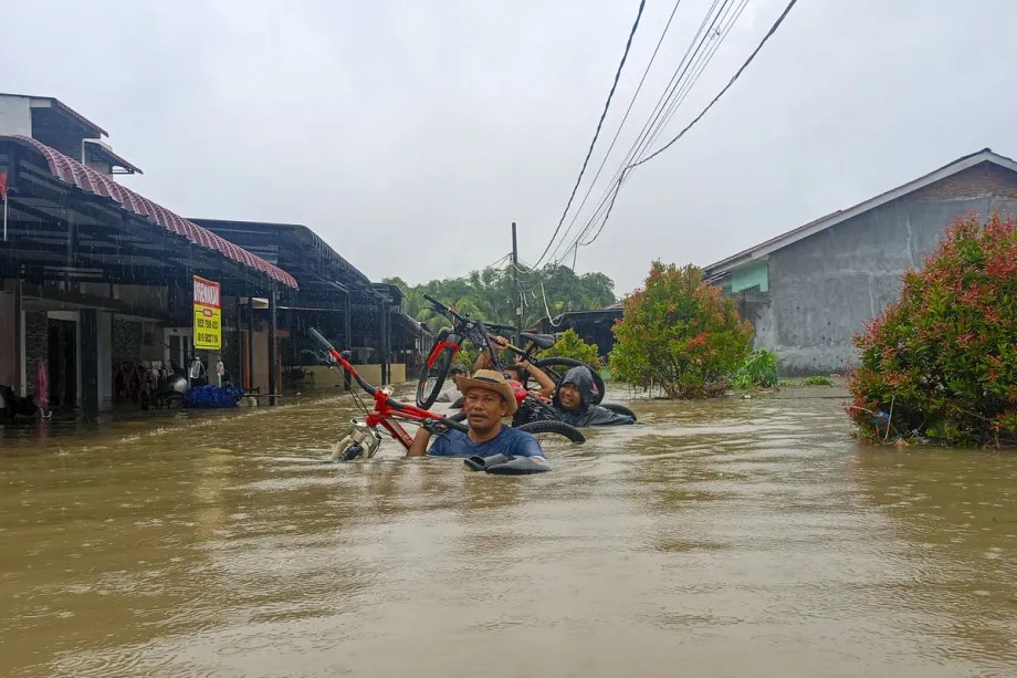 Photo of residents wading through flood water carrying their belongings to safety after heavy rain inundated neighborhoods in Medankrio district, Deli Serdang Regency, North Sumatera Province, Indonesia on November 27, 2025. [Photo credit Kiki Cahyadi and Anadolu Agency via Middle East Monitor.]